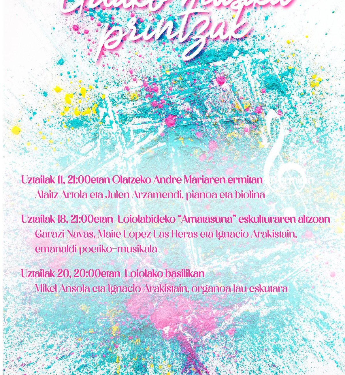 Debemos situar el origen de lo que hoy conocemos como el ciclo Udako Musika Printzak, una serie de conciertos que une música y patrimonio, en la primavera de 2021. A pesar de que Azpeitia (Gipuzkoa) cuenta con una vida cultural rica y diversa, percibía cierta dificultad o falta de oportunidades para presentar algunas propuestas. Este festival, que celebramos en julio, nació con el objetivo de dar espacio a proyectos de música clásica, jazz u otras propuestas que suelen tener menos presencia en la programación habitual del año. En aquella primera edición de 2021 aprovechamos el magnífico pórtico del Palacio Basazabal como escenario del concierto que reunió al txistulari Peio Irigoien, la cantante María Martín, la acordeonista Garazi Navas y el pianista Ignacio Arakistain. Aquella experiencia tan gratificante nos permitió dar continuidad a esta iniciativa que ha ido cobrando fuerza en los últimos años, y poner a su disposición los recursos necesarios para su crecimiento.