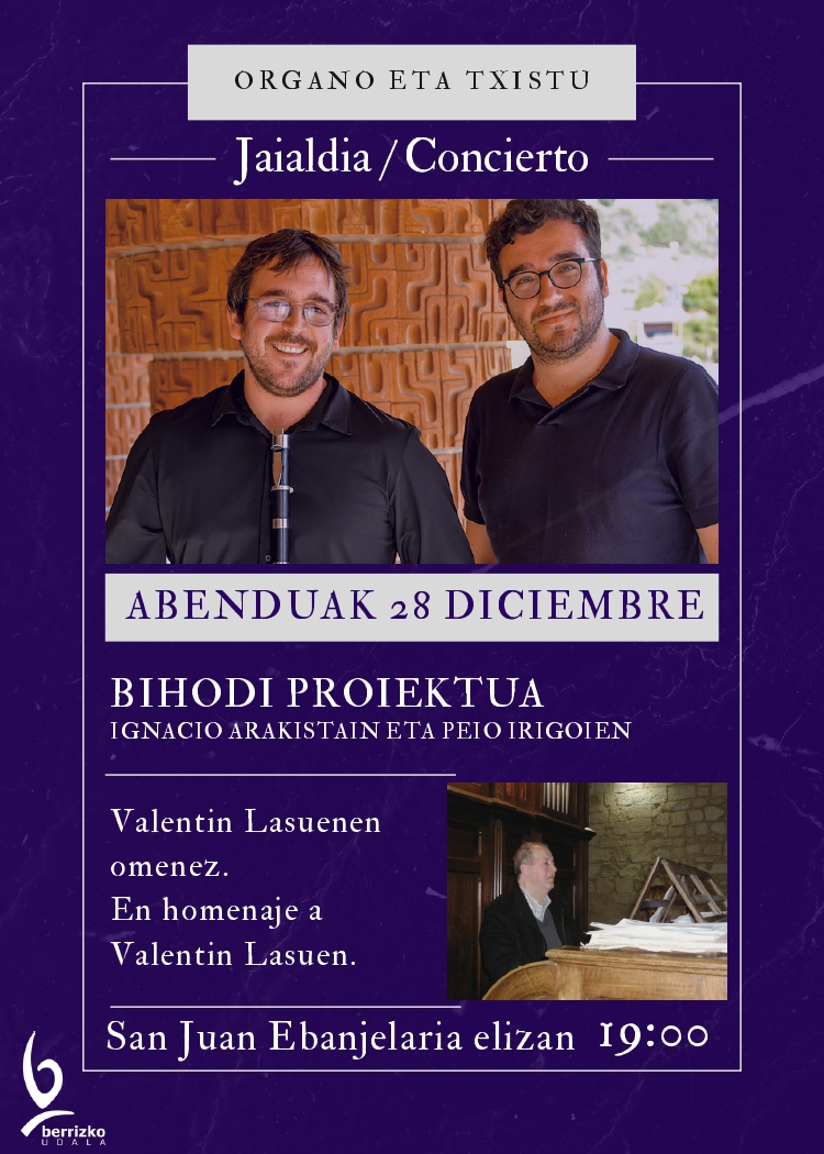 2024ko abenduaren 28an, Berrizen Valentin Lasuenen omenez eskainitako organo eta txistu emanaldia.